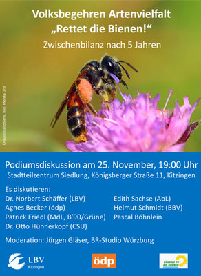 Am 25.11.2025 veranstalteten die LBV-Kreisgruppe sowie die Kreisverbände von B90/Die Grünen und der ödp eine hochkarätig besetzte Podiumsdiskussion zum 5-jährigen Jubiläum des Volksbegehrens "Rettet die Bienen". Es erfolgte eine kontroverse Diskussion zwischen anwesenden LAndwirten und den Vertretern der Träger des Volksbegehrens. Näheres herzu im Pressebericht im Pressespiegel.