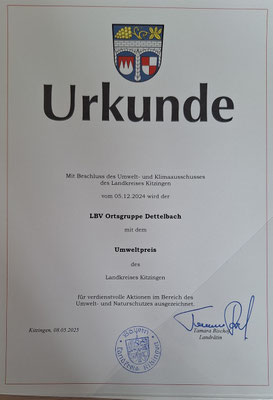 Die LBV-Ortsgruppe Dettelbach wurde am 08.05.2025 mit dem Umweltpreis 2024 des Landkreises Kitzingen ausgezeichnet. Nachstehend die LAudatio des Umweltreferenten des Kreistages und LBV-Kreisgruppenvorsitzenden Klaus Sanzenbacher: