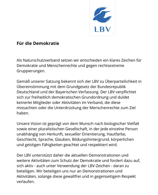 Der LBV-Landesvorstand hat in seiner Sitzung am 26. Januar entschieden, ein klares Zeichen für Demokratie und Menschenrechte und gegen rechtsextreme Gruppierungen zu setzen.