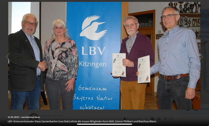 Im Mittelpunkt der Jahreshauptversammlung 2023 der Kreisgruppe Kitzingen des Landesbundes für Vogel- und Naturschutz (LBV) standen traditionell wie immer die Ehrungen für langjährige